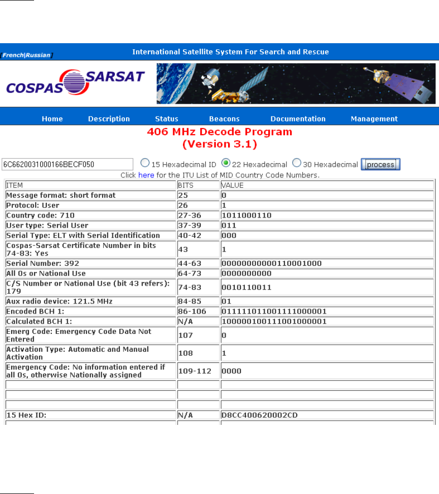Input the 22-digit hex code into the 406 MHz Decode Program provided. See below: