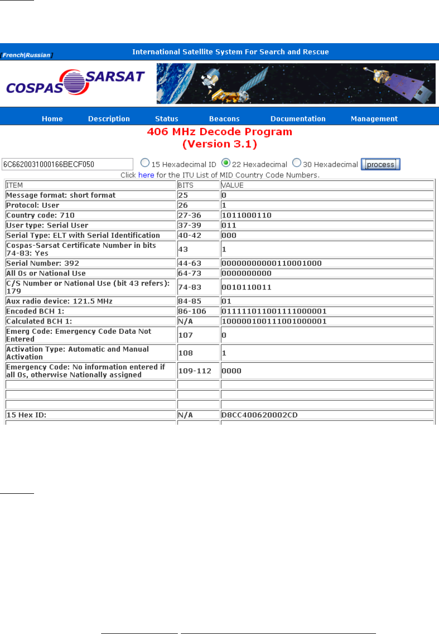 Input the 22-digit hex code into the 406 MHz Decode Program provided. See below: